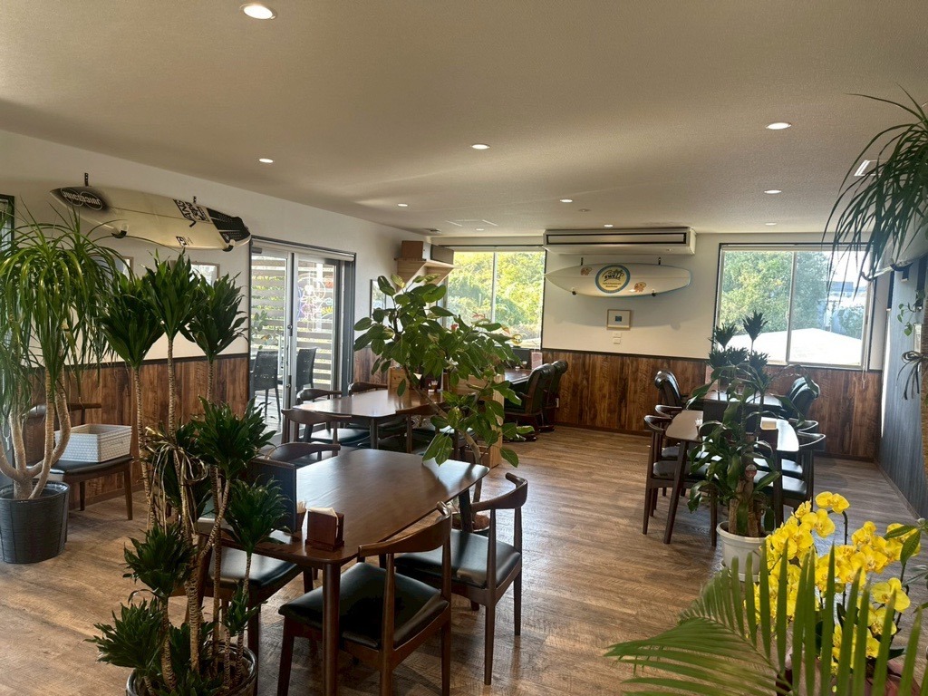 広々とした店内は観葉植物やサーフボードに囲まれて南国感満載!カウンター席もあり、そちらは壁で仕切られているのでお一人様でも過ごしやすい空間となっています。