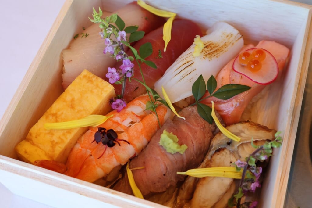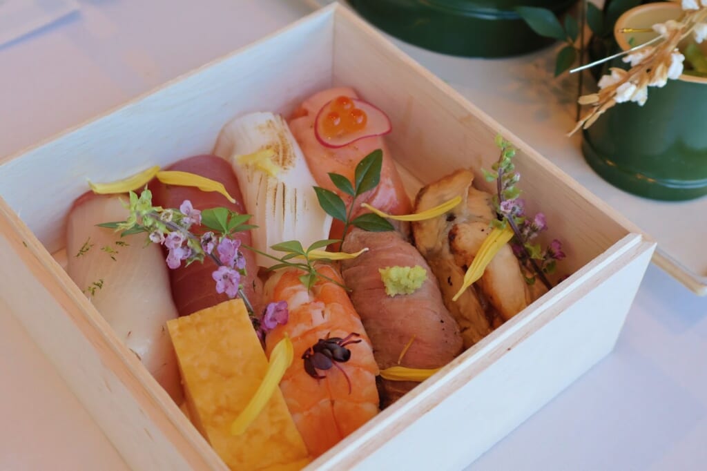 まず最初にいただいたのは、お祝いの席にふさわしいピンク包みの折箱に入った「寿司8種」。盛り付けが細やかで見た目も美しく、箱を開けた瞬間思わず感嘆の声が上がります。