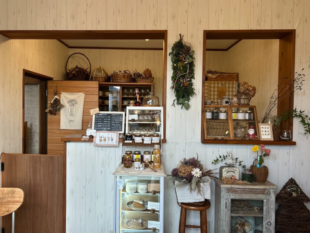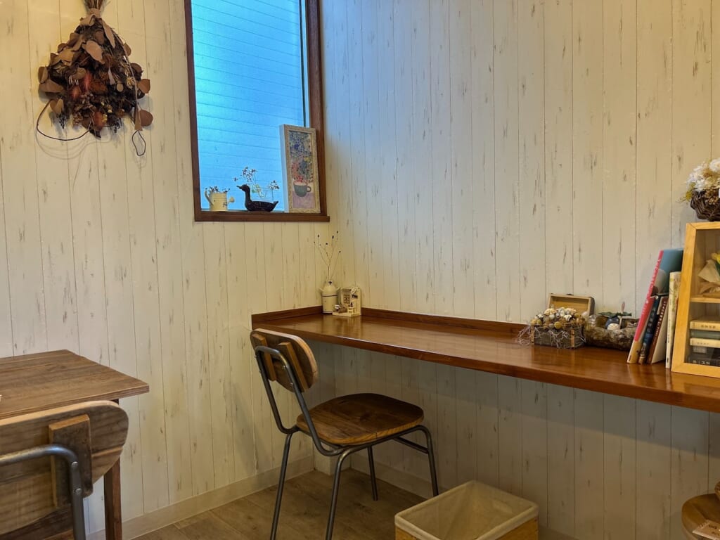 店内は、木の温かみを感じられる雰囲気で、ドライフラワーや小物で、細かい所までこだわりのつまったお洒落な空間です。