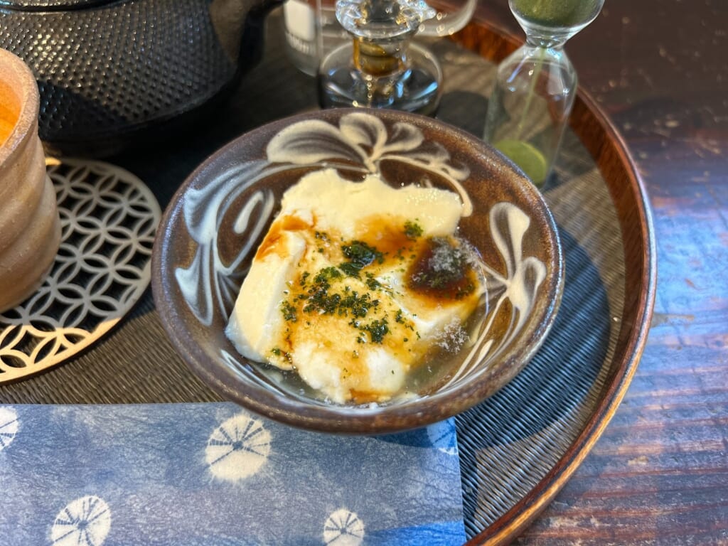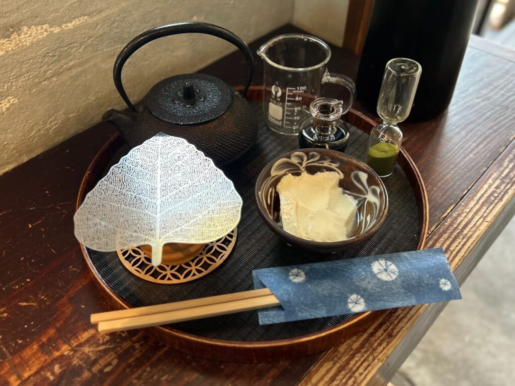 そして最後は、自家製豆花の上に茶葉をのせ、仕上げにほんの少し醤油をかけていただきます。これまた意外な組み合わせですが、香りの余韻を楽しみ、特別な締めくくりに。