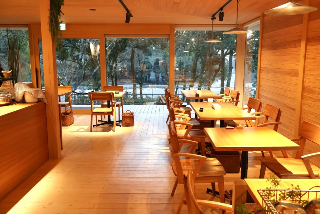 ガラス張りの店内からは、朝の光に照らされた関之尾の森と、悠々と流れる庄内川のパノラマが一望できます。