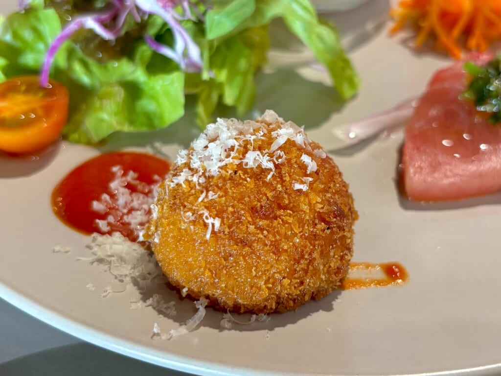 こちらのチーズが振りかけられた丸い一品は『アランチーニ』。ライスボールです。