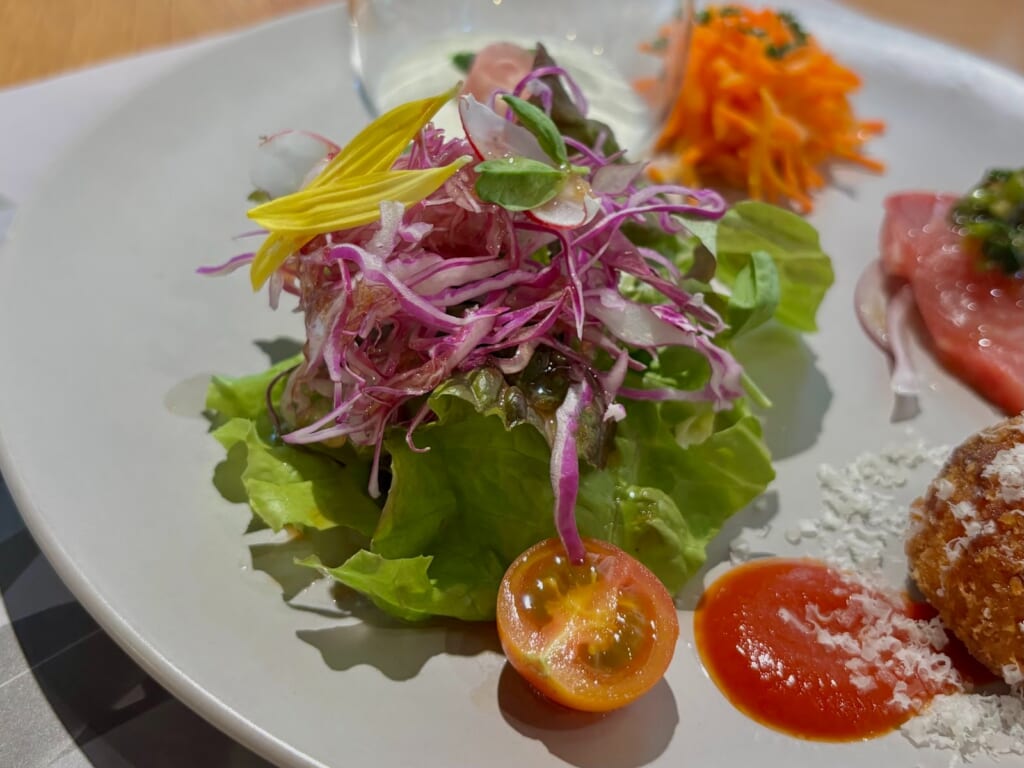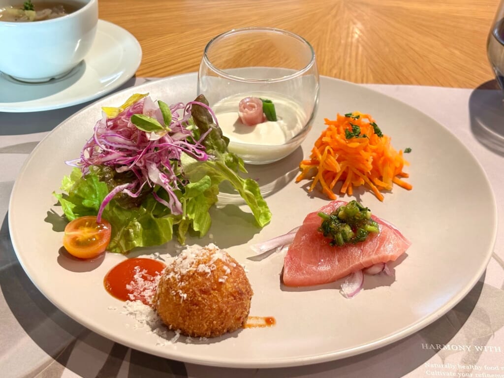 続いて運ばれてきたのは、ワンプレートに鮮やかな食材が並ぶ前菜。この日はなんと5種類も!