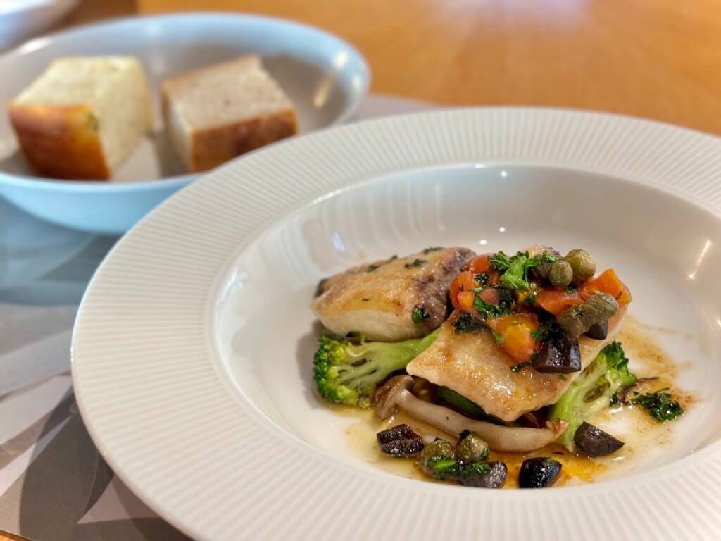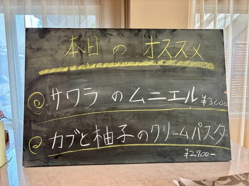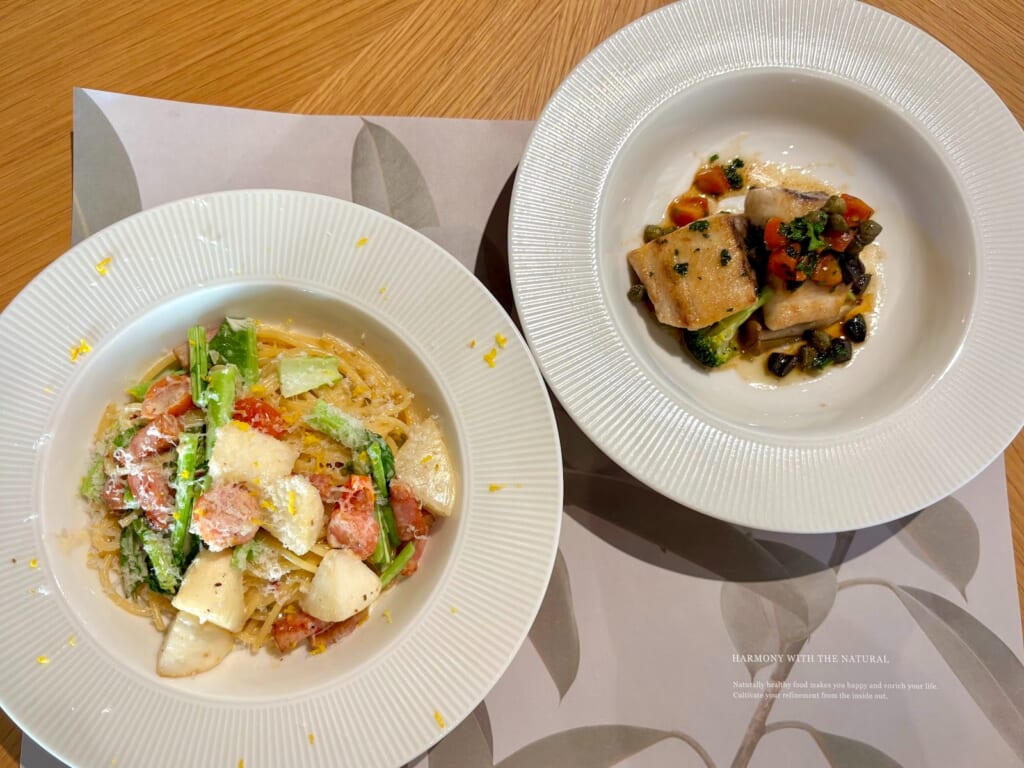 今回、いただいたランチは、『カブと柚子のクリームパスタ』(前菜・スープ・デザート・ドリンク付)と本日のメイン料理『サワラのムニエル』(前菜・スープ・デザート・ドリンク付)。どちらもこの日のオススメメニューです!