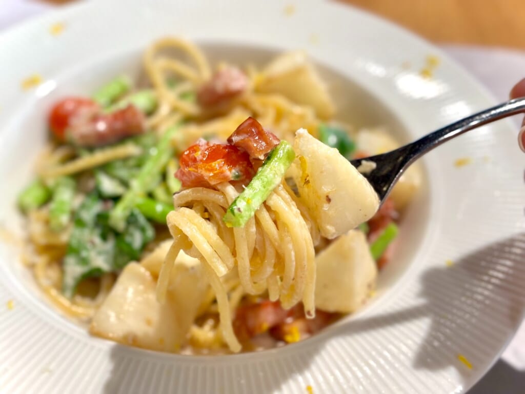 柚子の爽やかな香りと共に運ばれてきたのは、『カブと柚子のクリームパスタ』。お皿の縁に散りばめられたチーズの白と柚子の黄色が料理の華やかさをプラスしていました!