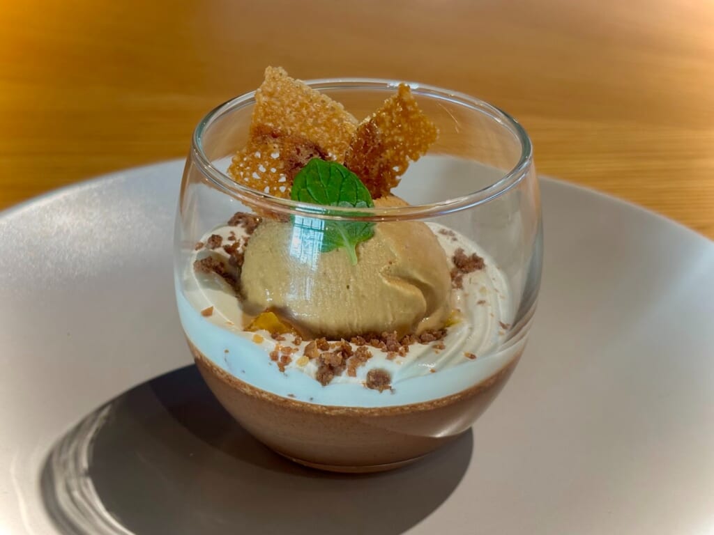 チョコプリンに生クリームホイップ、オレンジ、キャラメルアイス、アーモンドが重なり、贅沢な層となっていました!