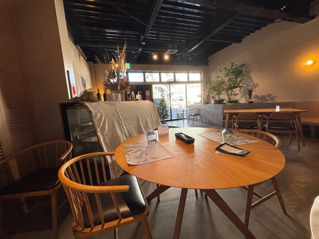 店内は、植物や木のぬくもりを感じるテーブルと椅子で温かみを演出しながら、露出天井にコンクリートの床がスタイリッシュさをプラス。広々とした開放的な空間です!
