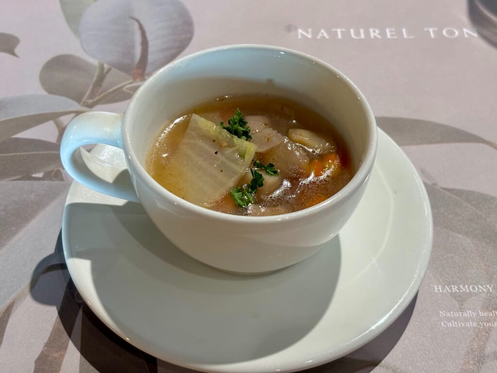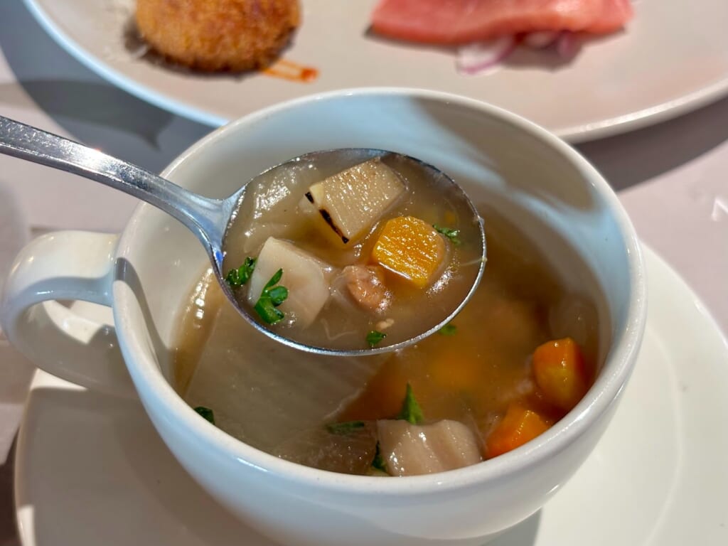 人参、玉ねぎ、白菜、ゴボウ、レンコンなど具だくさんで、心温まる一杯でした。季節ごとにスープの内容も変わるので、その時期ならではのスープを楽しめます!