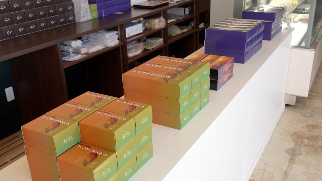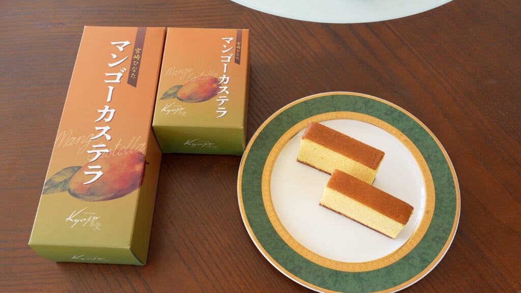 お店の看板商品は、素材の味を最大限に引き出した手作りカステラです。特に人気を集めているのが、鮮やかな黄色が美しい「マンゴーカステラ」。