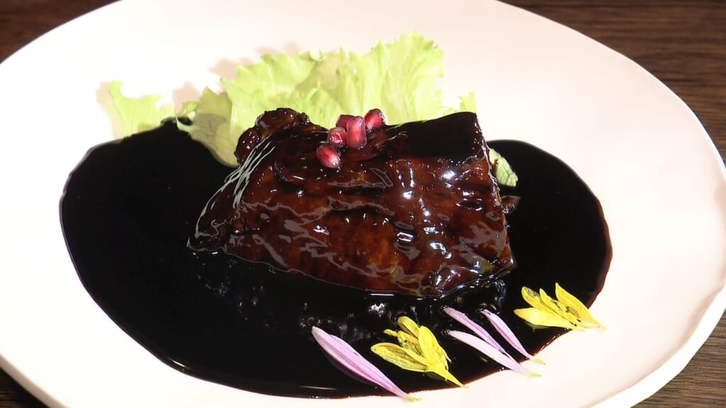 宮崎が誇るブランド豚「宮崎綾豚」の肩ロースを贅沢に使った一品です。低温調理で丸一日かけてじっくりと火を通すことで、驚くほど柔らかく仕上げています。黒酢の芳醇な香りとまろやかな酸味がお肉の旨味を引き立て、食欲をそそります♪
