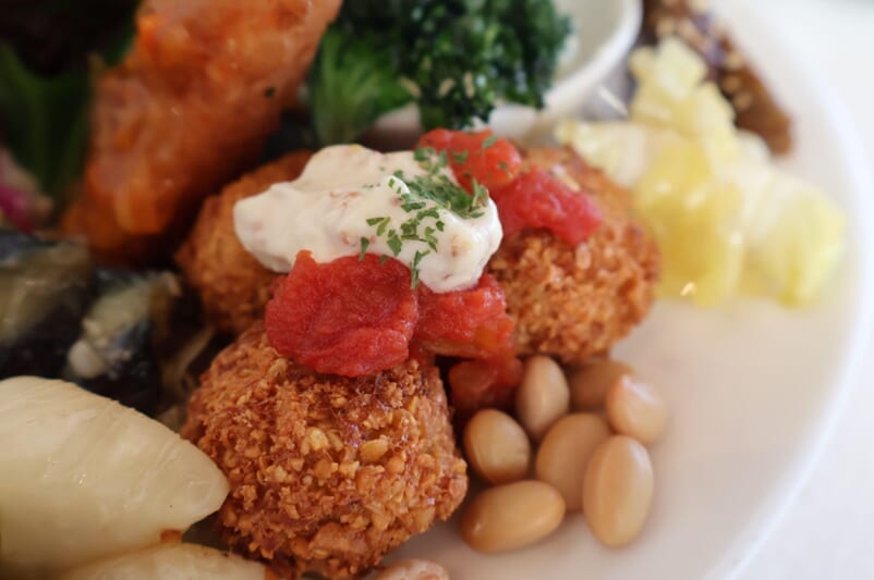 中東でよく食べられているというファラフェルは、ひよこ豆をすり潰したものにスパイスなどを加えてコロッケのように揚げたもの。外はサクサクで中はほろっとほどける、ひよこ豆の優しい密度を感じるお料理です。トマトソースと自家製の豆乳マヨネーズに豆の甘みが合わさってとっても美味しい♩
