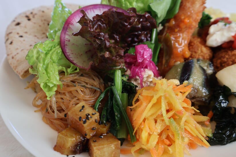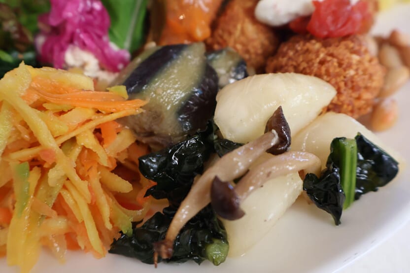 プレートに乗っている野菜のおかずはなんと10種類以上!青島・あらかわ農園のものや綾町産のものなど、その時々で数か所の農家さんから仕入れ、生産者さんの顔が見える野菜を使用しているそう。