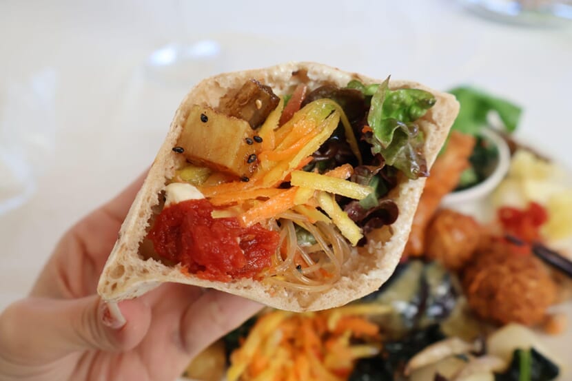 豆腐で作られたごまペーストのソースを付け合わせのピタパンにたっぷりと塗って、野菜を全種類できるだけぎゅっと詰め込んでいただきます!