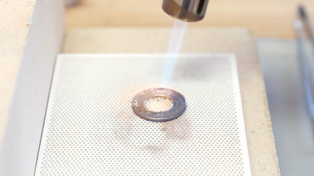 次に、バーナーでコインを炙って金属を柔らかくする「焼きなまし」という工程へ。炎に炙られてコインの色がみるみる変わっていく様子は、本格的な職人体験そのものです。