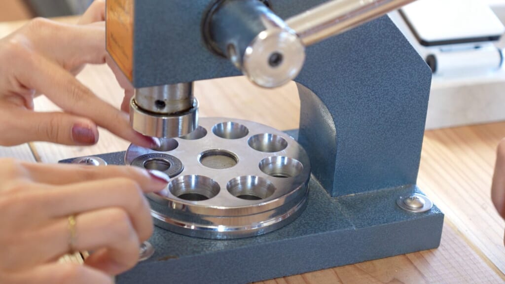 制作体験は、約1時間半。まずは専用の道具を使い、選んだコインの真ん中を打ち抜きます。