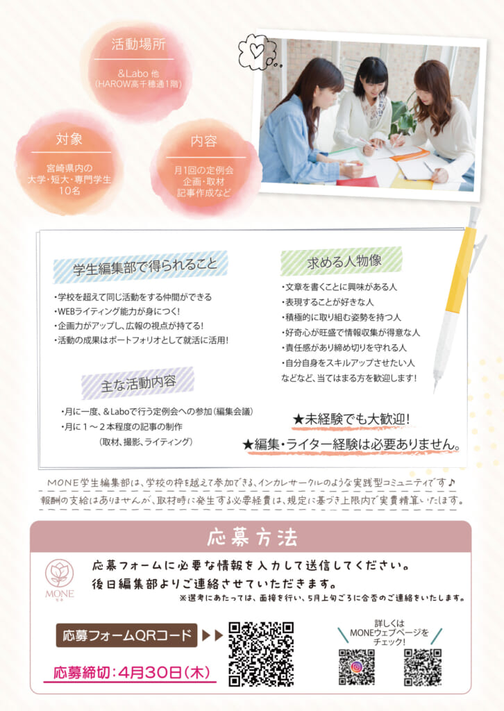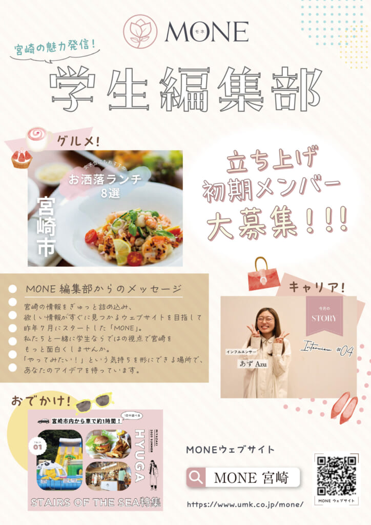 大学生活の“いま”を、ちょっと特別に。MONEでは、学生ならではの視点で、宮崎をもっと面白くする仲間を募集します。あなたの「好き」や「気になる」を、記事という形で発信してみませんか?