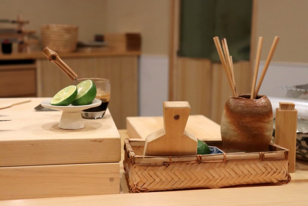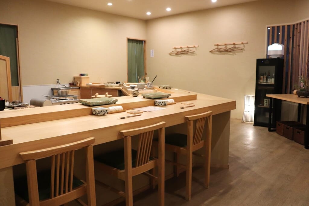 白い暖簾をくぐると、木のぬくもりが広がるカウンターが9席。特別感がありながらもどこかホッと落ち着く雰囲気です。