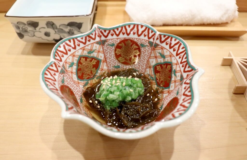 最初に登場したのは、もずくの上に刻んだオクラをのせ、優しいお出汁でまとめた酢の物。もずくのつるりとした食感とオクラのネバネバが同時に楽しめます。