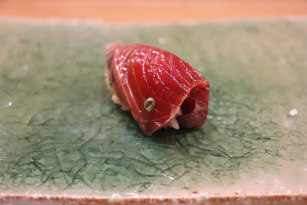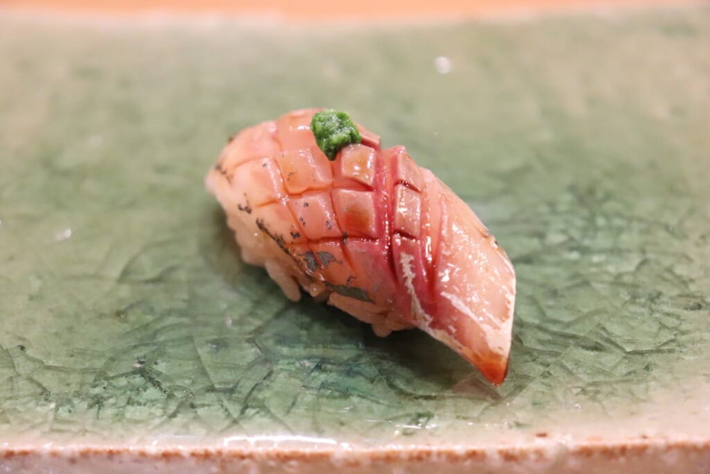 次は握りが登場。まずは熊本県天草市で獲れた「ヤイトガツオ」の握り。漁獲量が少なく一般市場には滅多に出回らないため、「幻の高級魚」と呼ばれているヤイトガツオを10日間熟成。一口食べると、濃厚な旨みが下の上でスッと消えていきました。