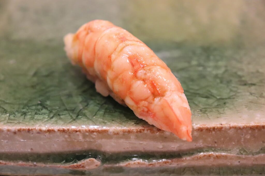 さらに鹿児島県で水揚げされた足赤えび!はらわたを丁寧に取り除き数日間熟成。えび本来の甘味とねっとりとした舌触りがクセになる一貫です。