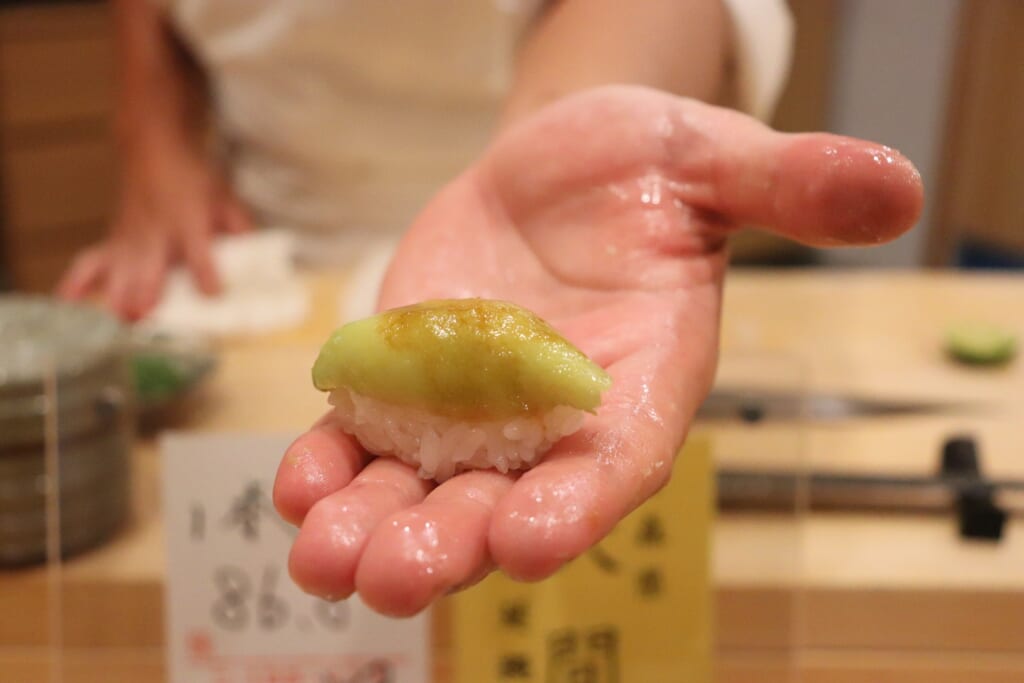 「崩れやすいので手渡しです」と大将からそっと差し出されたのは、佐土原なすのにぎり。やわらかい果肉が特徴で、ほんのり付いている甘ダレとの相性も抜群でした。