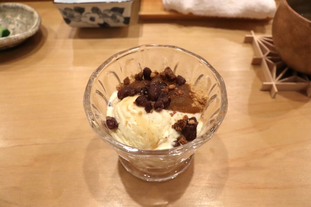 コースの締めくくりは、わらびもちパフェ。パフェを受け取ると、出来立てのわらび餅がほんのり温かく、冷たいバニラアイスとの調和がお見事です。また焼酎のアルコールを飛ばしたもろみや胡桃、それぞれの食感が重なりあい、甘味の奥にほのかな甘さが感じられました。