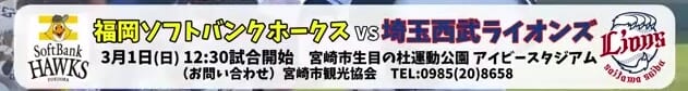 ・3月1日(日)12:30~ 福岡ソフトバンクホークス vs 埼玉西武ライオンズ(宮崎市生目の杜運動公園 アイビースタジアム)