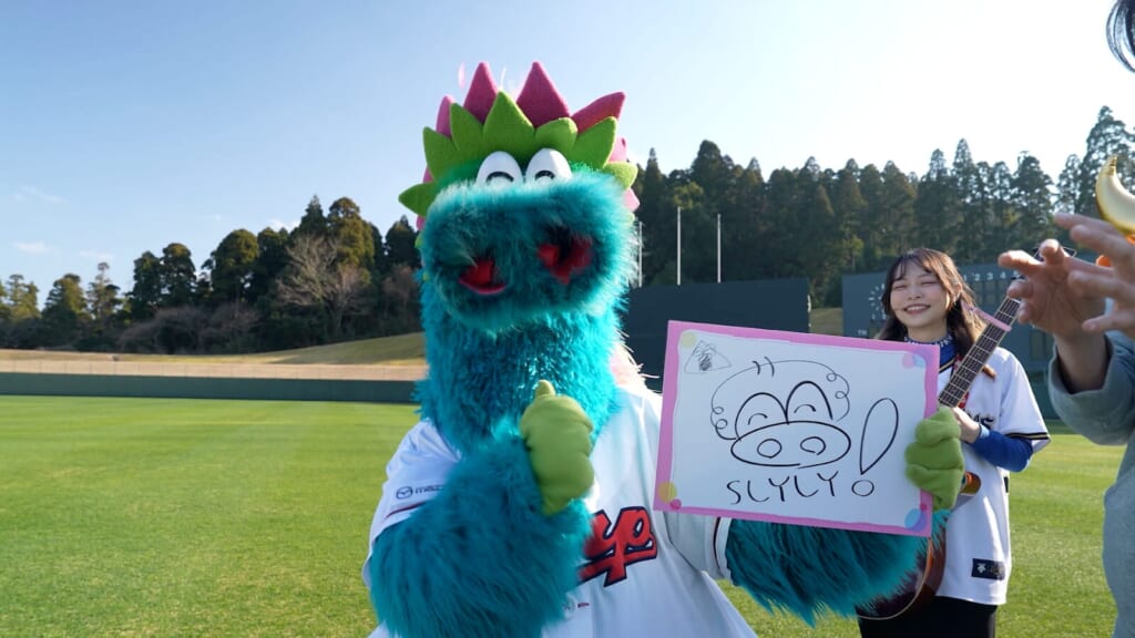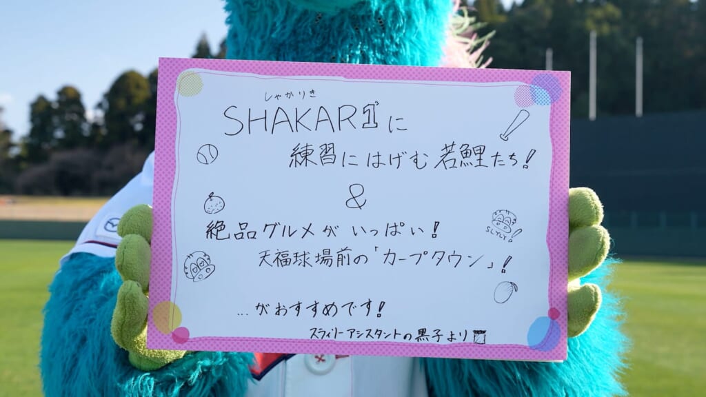 マスコットのスラィリーが、見どころを紹介!「しゃかりきに練習にはげむ若鯉たち」と、「絶品グルメがいっぱいの天福球場前のカープタウン」がおすすめとのことですよ♩もちろん、おちゃめなスラィリー自身の活躍にも注目です!!