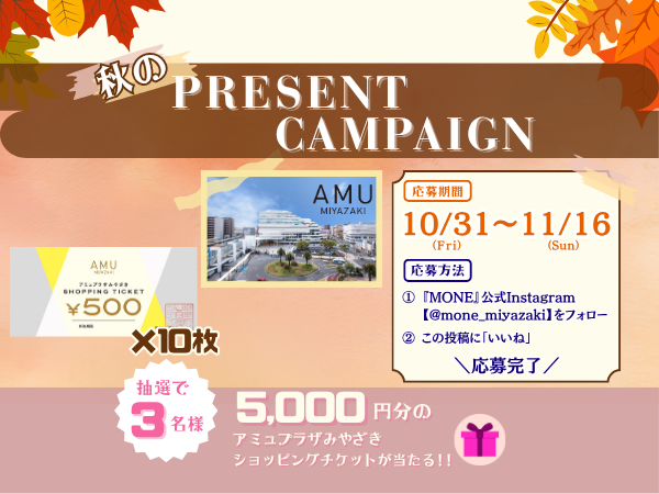 【MONE】フォロー&いいねでプレゼントが当たる秋のキャンペーンを公式Instagramにて開催中!