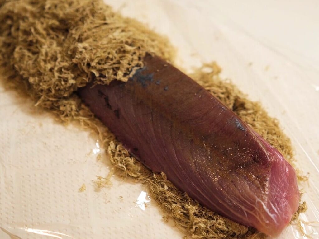 03 昆布締めした魚をラップから外し、薄切りにする。