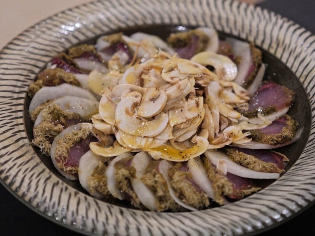 食べる直前にカルパッチョ全体に回しかけ、黒こしょうをひとふりして完成。