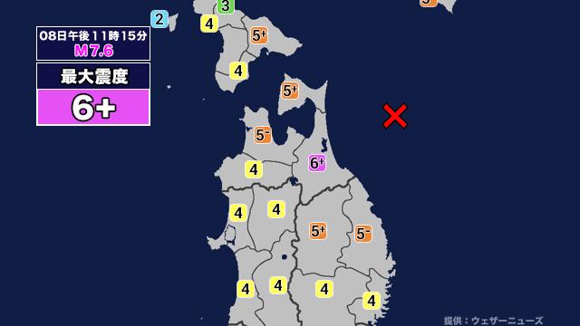 2025年12月08日午後11時15分ごろ、青森県東方沖を震源とする最大震度6強の地震が発生しました。