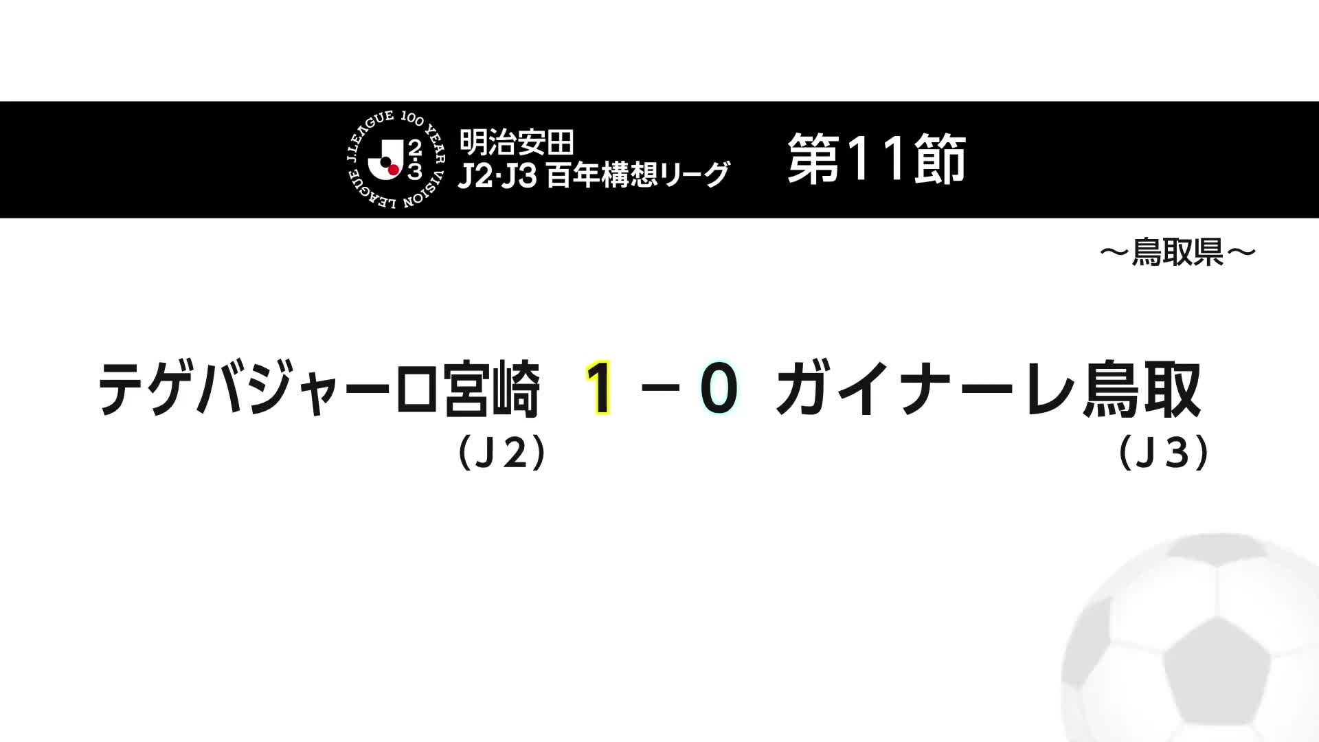 サッカー明治安田J2・J3百年構想リーグは第11節。テゲバジャーロ宮崎はアウェーでJ3のガイナーレ鳥取と対戦、前半に挙げた1点を守り抜き1対0で勝利しグループ首位を守りました。