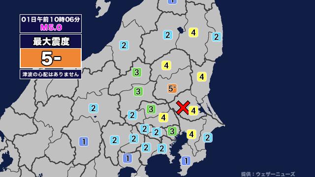【地震】茨城県南部を震源とする最大震度5弱の地震が発生 津波の心配なし