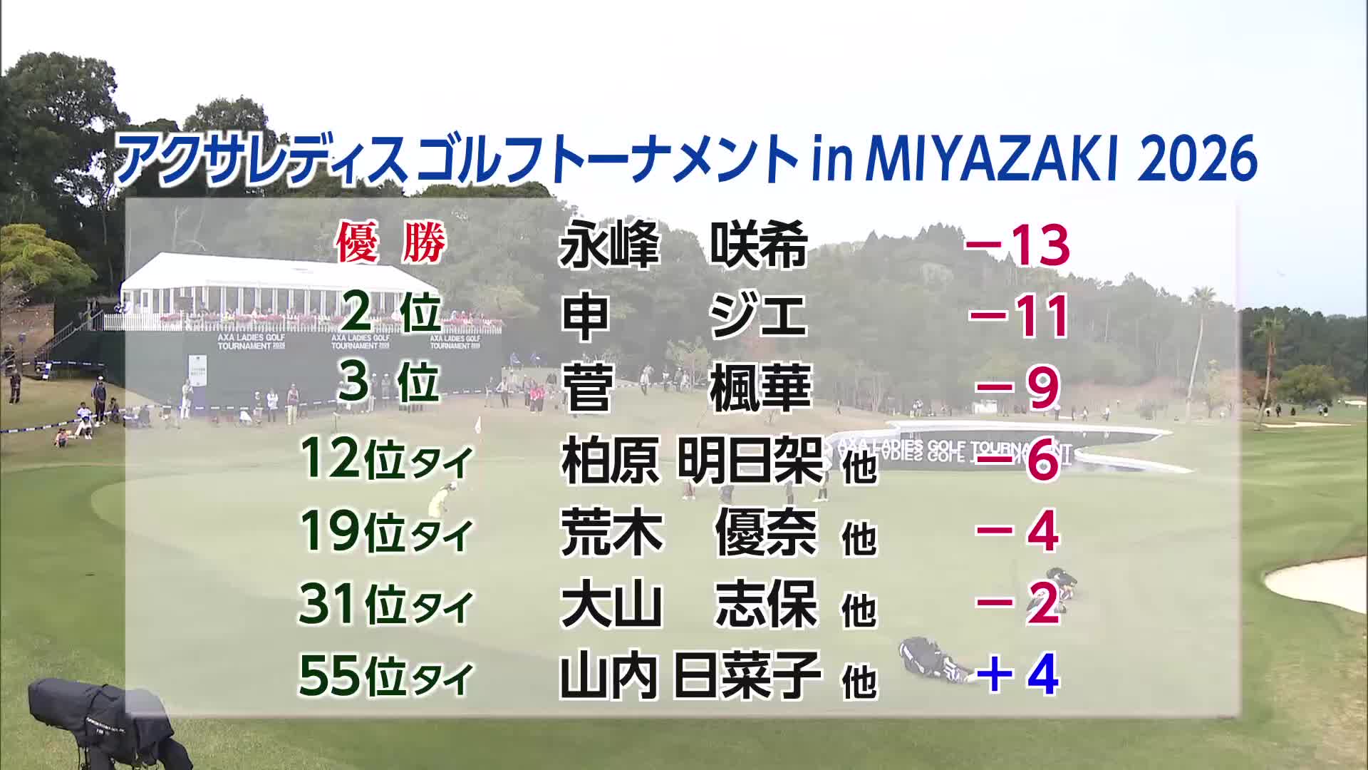 柏原明日架は6アンダー12位タイ、荒木優奈は4アンダーの19位タイ、大山志保は2アンダー31位タイでした。