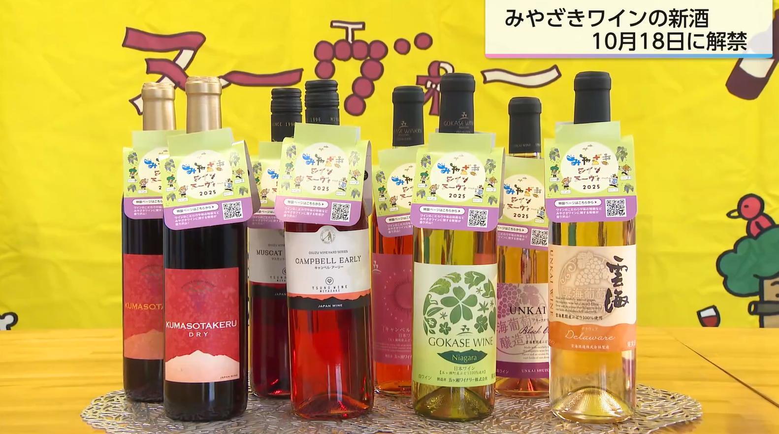宮崎県内には九州で最も多い6つのワイナリーがある。そのうち、「五ヶ瀬ワイナリー」「都農ワイナリー」「都城ワイナリー」「雲海葡萄酒醸造所」の4社が生産したワインの新酒が、10月18日に一斉に販売解禁される。2025年の夏は厳しい暑さが続いたが、この暑さがワインの香りを豊かにする効果をもたらしたという。