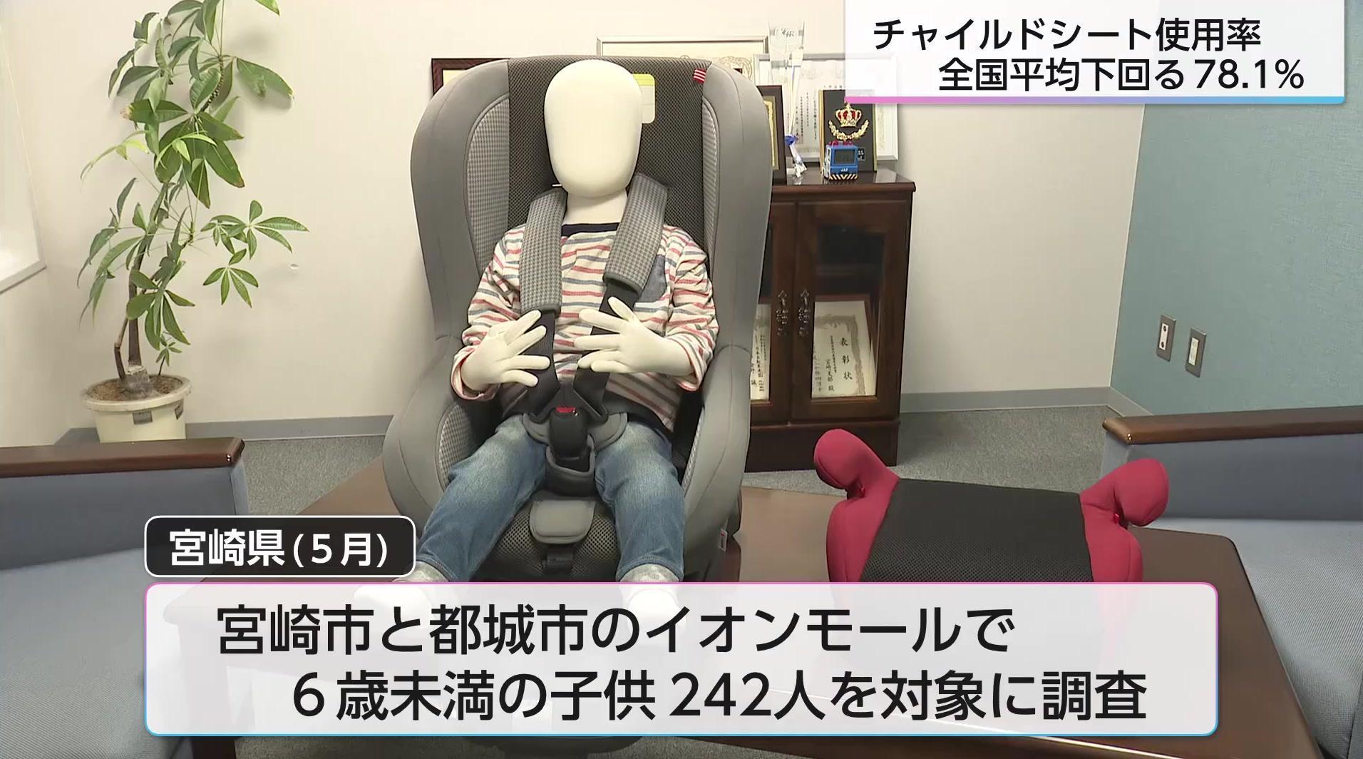 JAF(日本自動車連盟)と警察庁は全国で合同調査を実施した結果、宮崎県内のチャイルドシート使用率は78.1%だった。前年より約15ポイント上昇したものの、全国平均は82.4%。3年連続で全国平均を下回る結果だった。