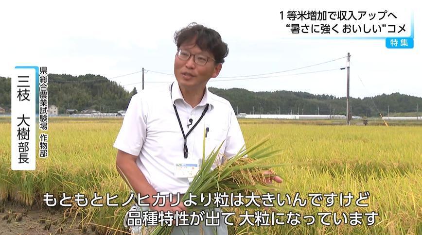 もともと「ヒノヒカリ」より粒は大きいけど、品種特性がしっかり出て大粒になっている。高温では「ヒノヒカリ」の等級が低下することもあり、新しい品種、特に高温に強い品種が望まれている。