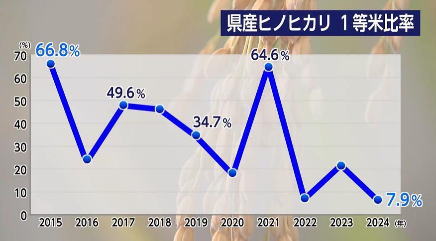 県産「ヒノヒカリ」は、コメの等級で最も高い1等米の比率が年々低下しており、年によって変動はあるものの、10年前には66.8%だったものが昨年は7.9%まで低下した。