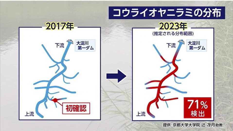魚が水中に出した糞などのDNAから、生息域がどれだけ広がっているか調査したところ、2017年の初確認からわずか6年後...。都城市の大淀川水系の71%で、コウライオヤニラミのDNAが確認された。