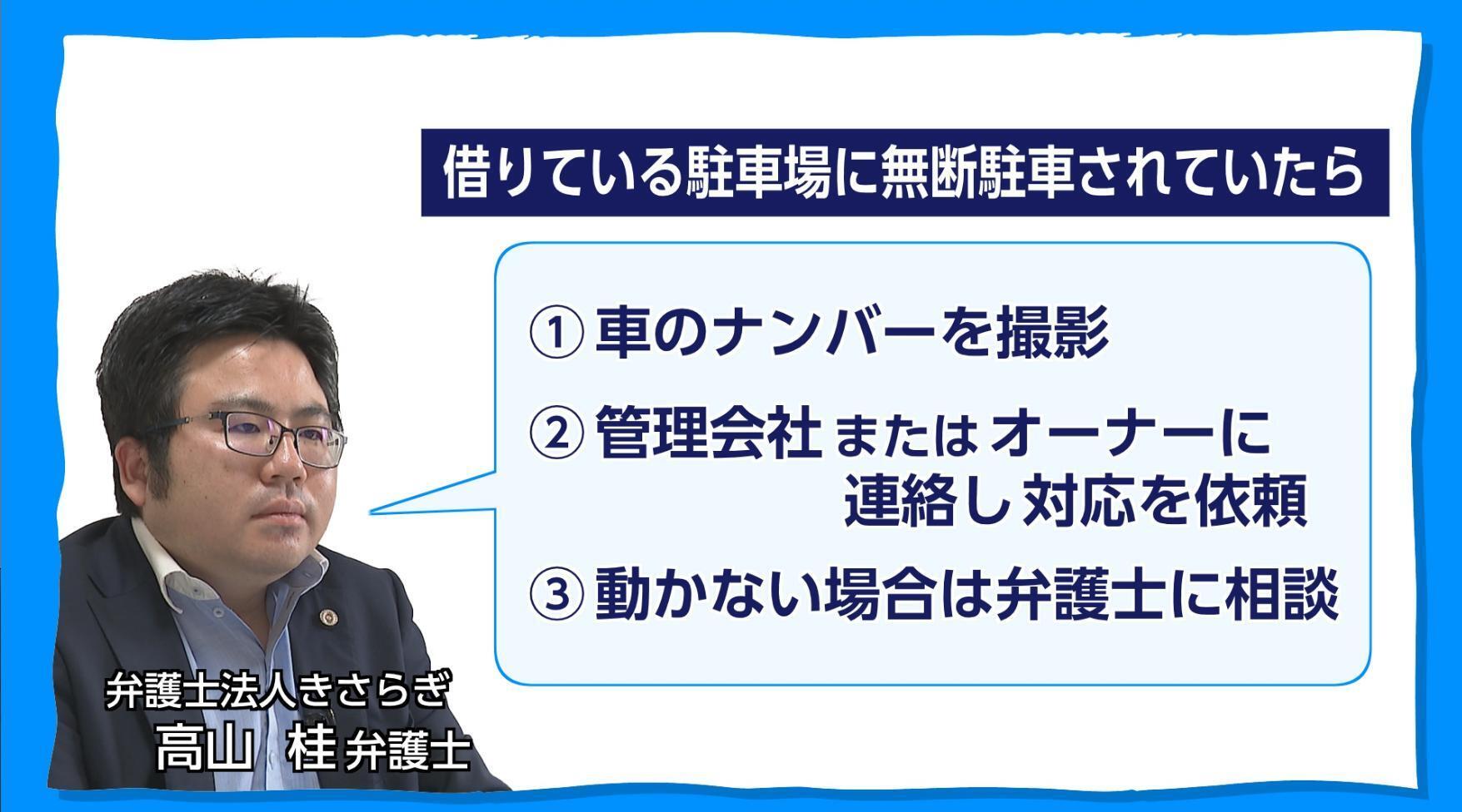 一方、自分が借りている駐車場などに無断駐車された場合はどうすればいいのだろうか。弁護士法人きさらぎの高山桂弁護士によると、まず「車のナンバーを撮影」し、「管理会社やオーナーに連絡」して対応を依頼するのが手順となる。それでも長期間、車が動かない場合には、「弁護士に相談」してほしいとの事だ。