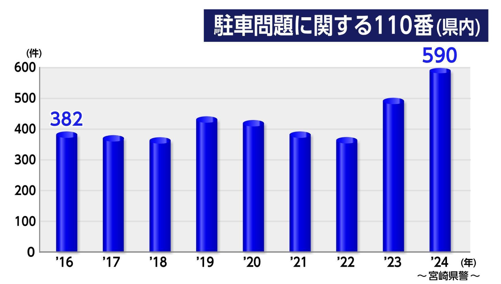無断駐車や路上駐車に関する110番通報。宮崎県内では400件前後で推移していたが、2023年度に約500件。2024年度には590件に上り、過去10年間で最多となった。