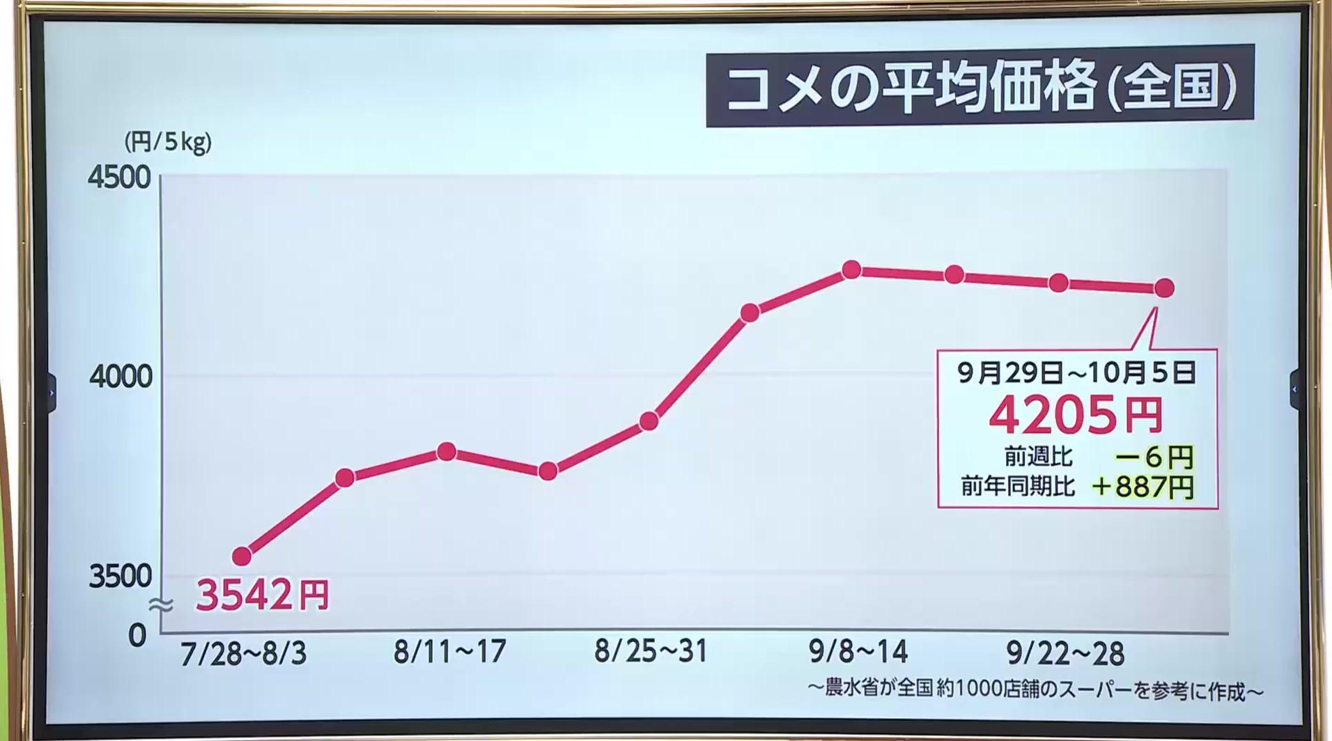農林水産省によると、スーパーでのコメ店頭価格の平均は、10月5日までの1週間が5キロあたり4205円となり、前年同時期と比べて887円高騰した。これは5月に記録した過去最高値と同じ水準となっている。
