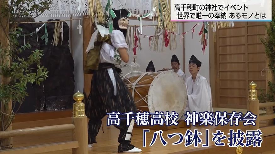 イベントでは、国の重要無形民俗文化財に指定されている「高千穂の夜神楽」の演目の一つ、「八つ鉢」が高千穂高校の神楽保存会によって披露された。
