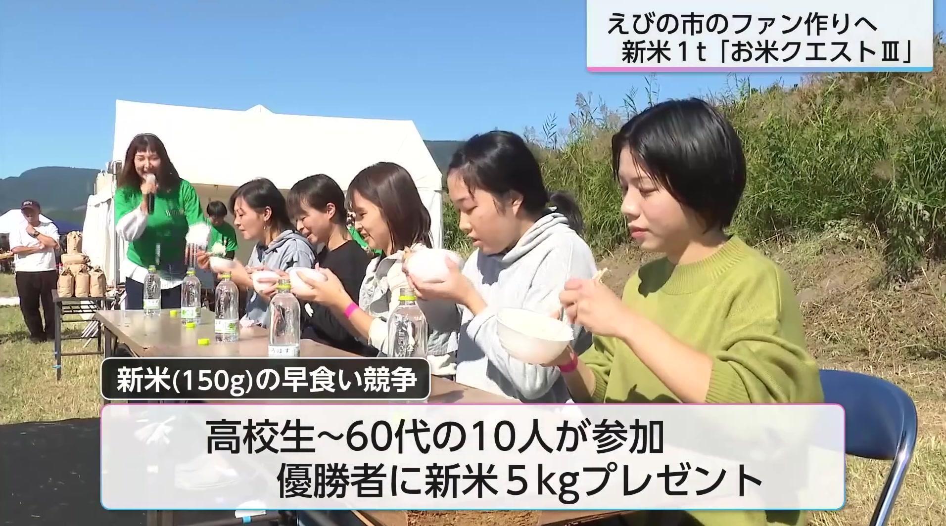 地元の特産品である新米「ヒノヒカリ」をテーマにした食のイベント「お米クエストⅢ」が宮崎県えびの市で開催された。県内5つの米どころが協力し、約1トンもの新米を準備。入場料500円で「新米食べ放題」のほか、「米の早食い競争」や「効き米」が行われた。