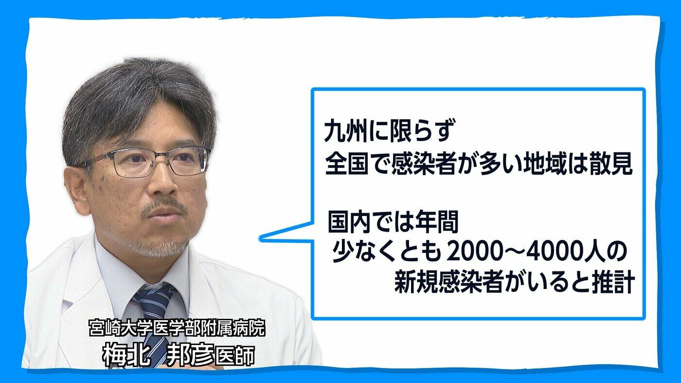 梅北医師は、「現在は九州に限らず、全国で感染者が多い地域が散見される。国内では年間少なくとも2000人から4000人の新規感染者が推計される」と話している。