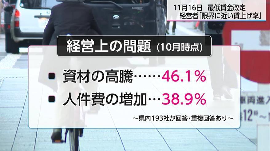 県中小企業家同友会が県内の中小企業193社を対象に実施した調査では、2025年10月時点で経営上の最も大きな問題点として「資材の高騰」を挙げところが46.1%と最多だった。その次に高いのが「人件費の増加」で、38.9%となっている。