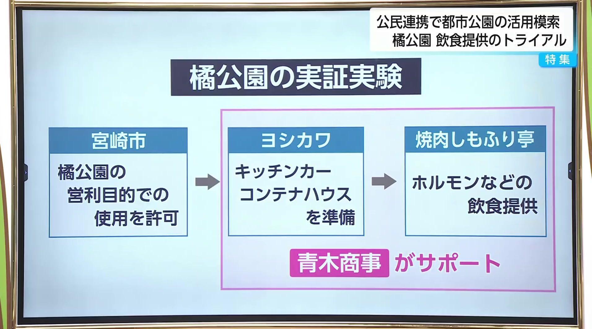 ヨシカワに声をかけたのは、不動産事業などを手掛ける宮崎市の青木商事。同社は、大分県別府市の春木川公園における民間活用で企業を誘致し、立体都市公園の整備に携わった実績を持つ。