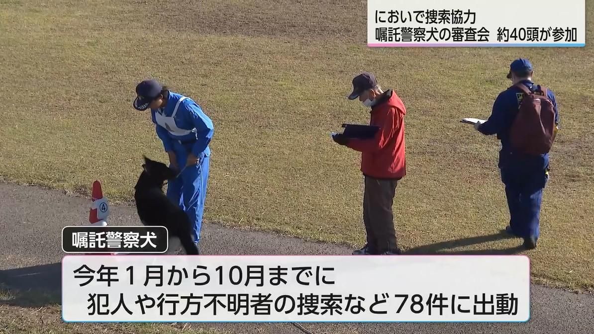 犯人や行方不明者の捜索にあたる嘱託警察犬の審査会が宮崎市で開かれた。約40頭が参加し、足跡追及審査などで日ごろの訓練成果を発揮した。県警によると、2025年1月から10月までに、嘱託警察犬は78件の出動があったという。合格すると2026年4月からの1年間、県民の安全のために活躍する。
