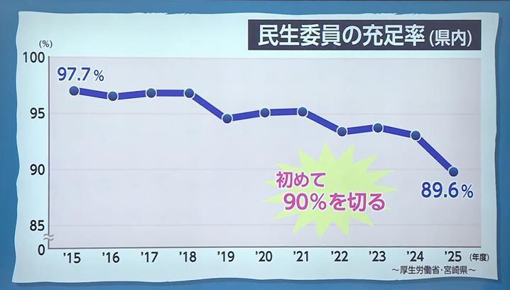 宮崎県の民生委員の充足率右肩下がりで、2025年度は89.6%と、初めて90%を割り過去最低となった。